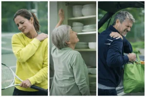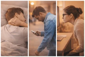 Frau am Schreibtisch mit Nackenschmerzen, Fehlhaltung mit großer Handtasche, Mann sitzt krumm mit Smartphone auf dem Sofa